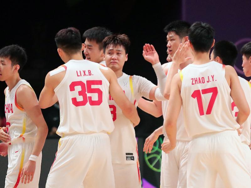8月16日,在亚洲杯半决赛中,中国队98比84战胜新西兰队,晋级决赛。赵睿(中)动情与队友庆祝胜利。新华社发