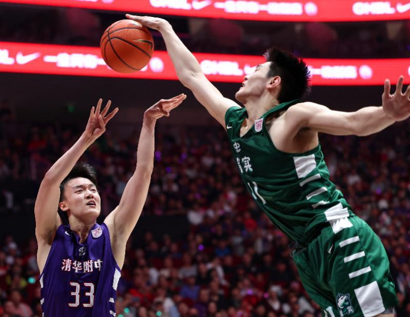5月25日,在耐高联赛全国总决赛上,广东实验中学队球员王洪泽(右)在比赛中封盖清华大学附属中学队球员洪麦。 新华社发